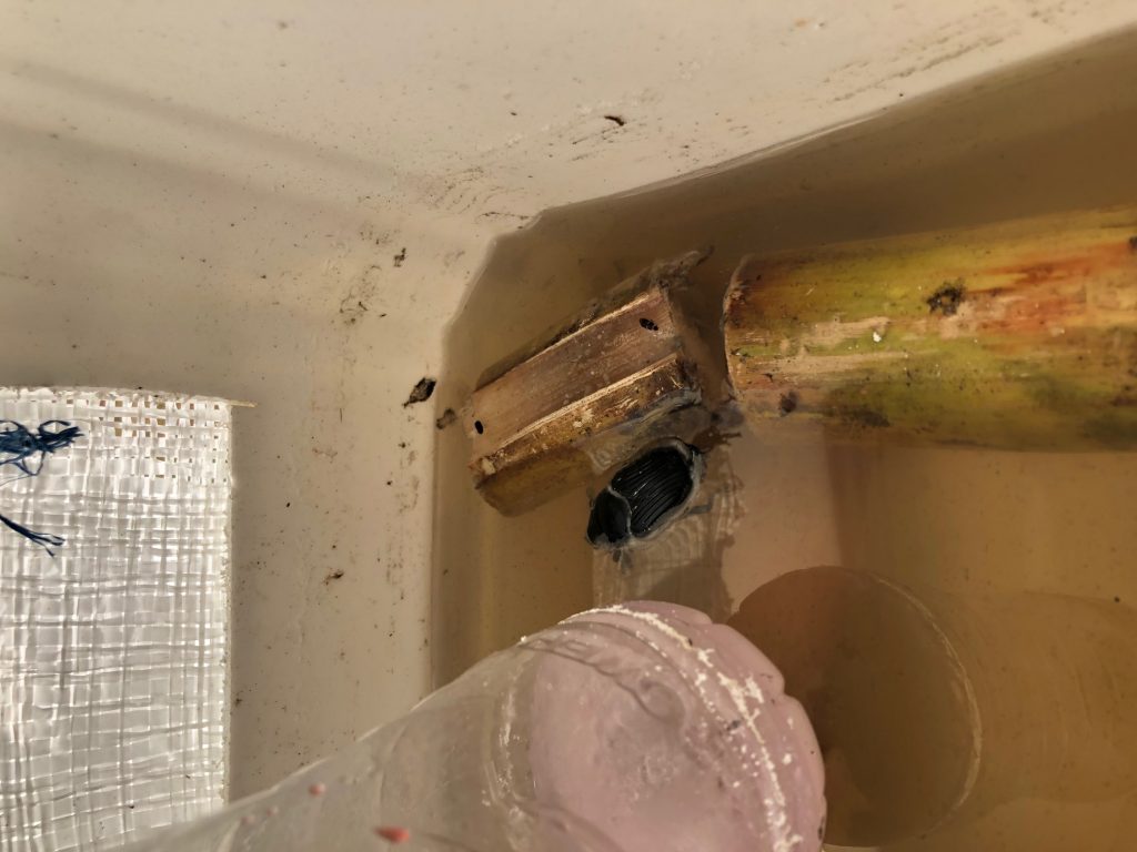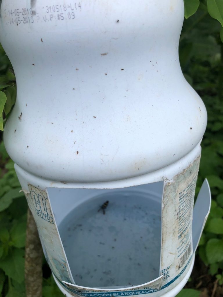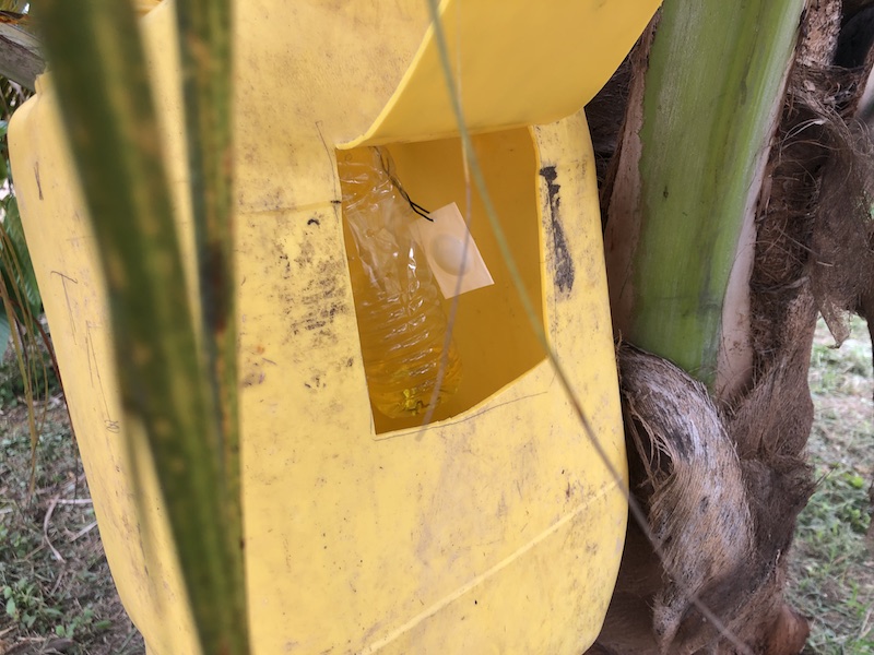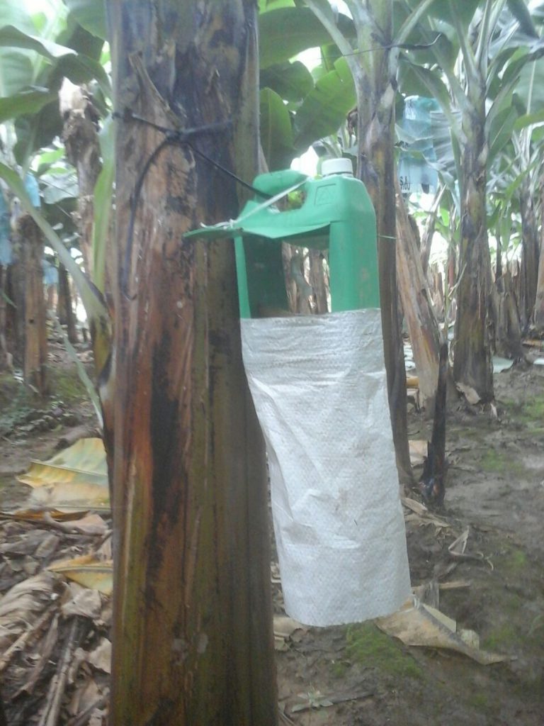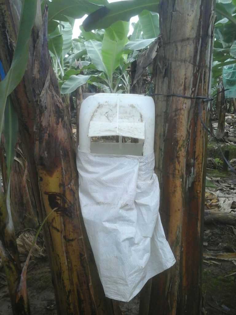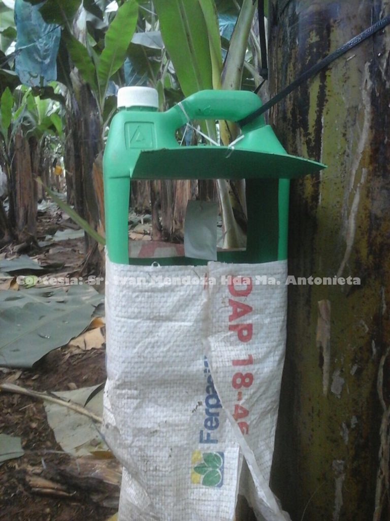 Nuestra experiencia nos llevó a adaptar la trampa del adulto de R. palmarum o su nombre común “Gualpa” de las plantaciones de palma africana a las plantaciones de banano.