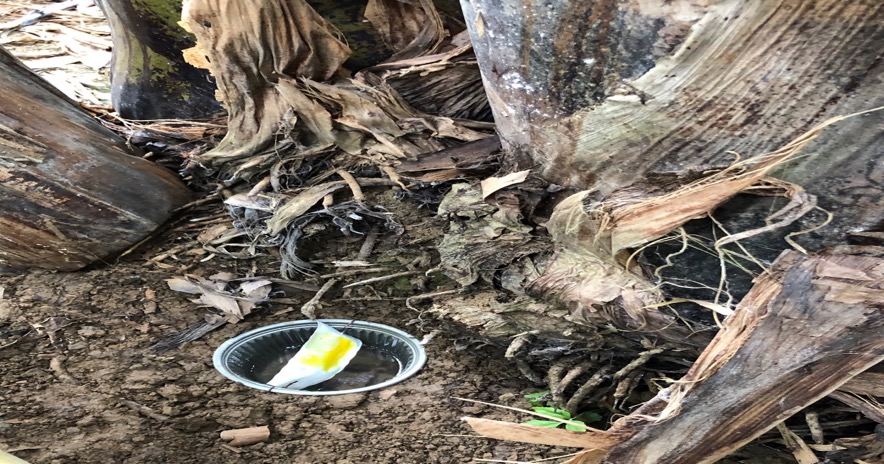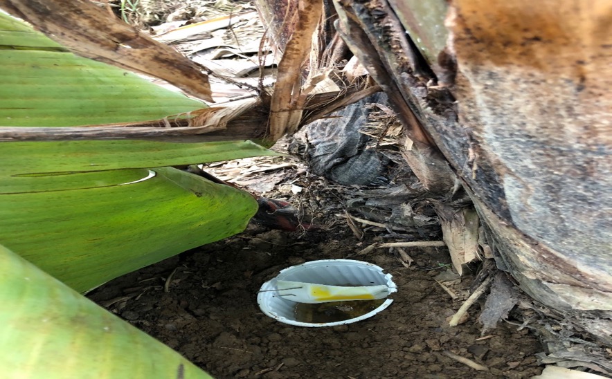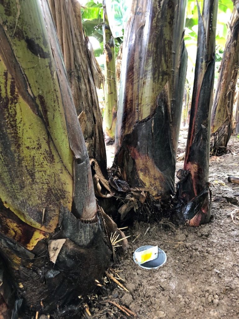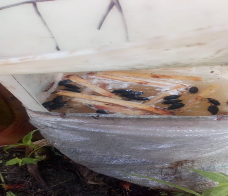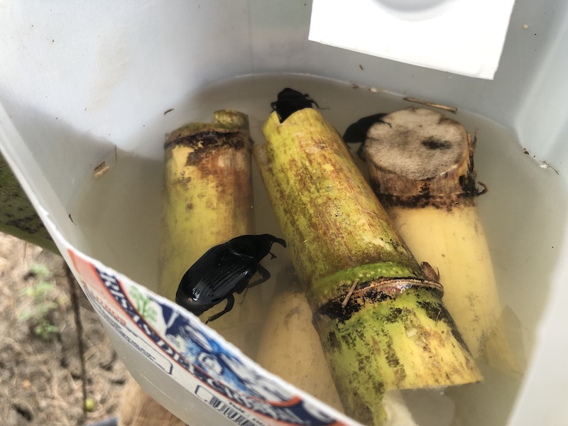 Movimiento de R. Palmarum en bananeras comerciales. Atracción producida por la descomposición del pseudotallo de la musáceas. Movilidad del coleóptero cuyo habitad es desde plantaciones cercanas de palma africana o cocoteros hacia las bananeras de exportación. Los Rios, Ecuador.