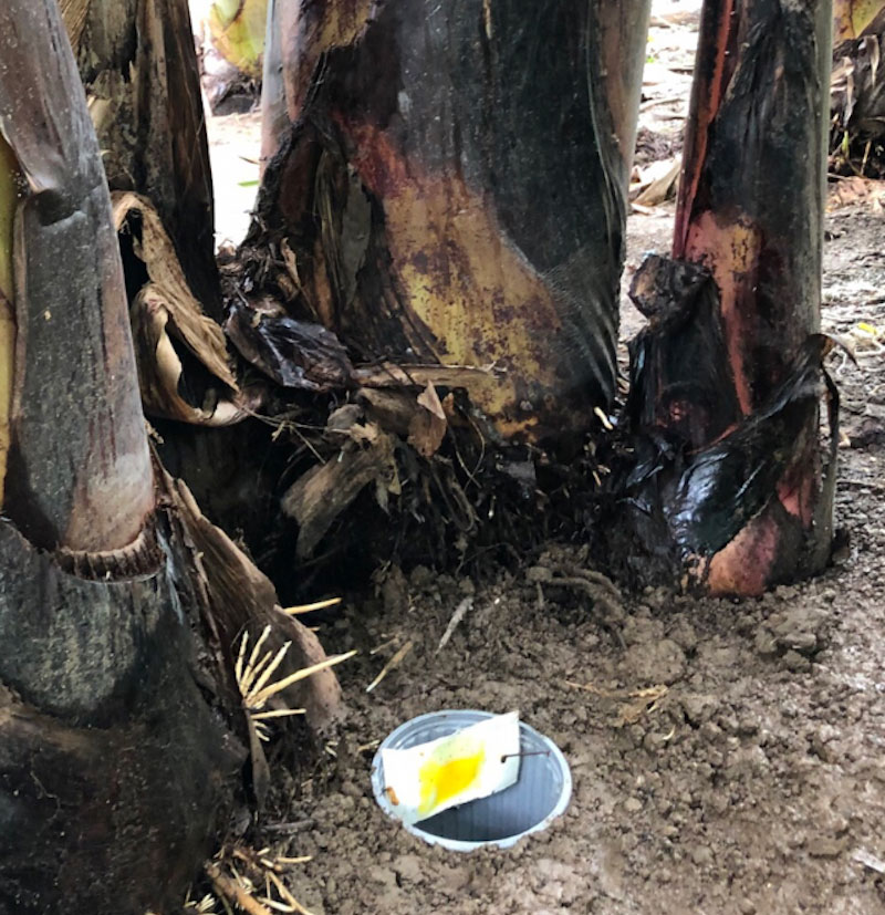 En las plantaciones de banano ecuatoriano, las trampas de feromonas se utilizan para monitorear y controlar al picudo del banano (Cosmopolites sordidus). Otra forma de atrapar los picudos consiste en colocar partes de pseudotallos en el suelo para que actúen como trampas. Esta práctica tiene baja eficacia y genera conteos falsos, puesto que los picudos se pueden salir, a menos que las trampas se cebe con insecticida. Los pseudotallos al descomponerse al tercer día ya no será efectiva en la atracción del C. sordidus, sino en la atracción del Metamasius hemipterus o picudo rayado por la emisión de fenoles del pseudotallo en descomposición. Olor apetecido por el M. hemipterus.